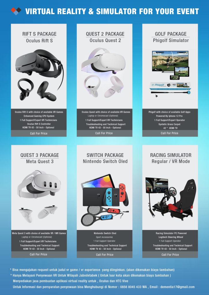 Kami menyediakan jasa sewa perangkat VR HTC Vive, Oculus Rift S, Quest 2 dan juga jasa pembuatan aplikasi Custom VR.